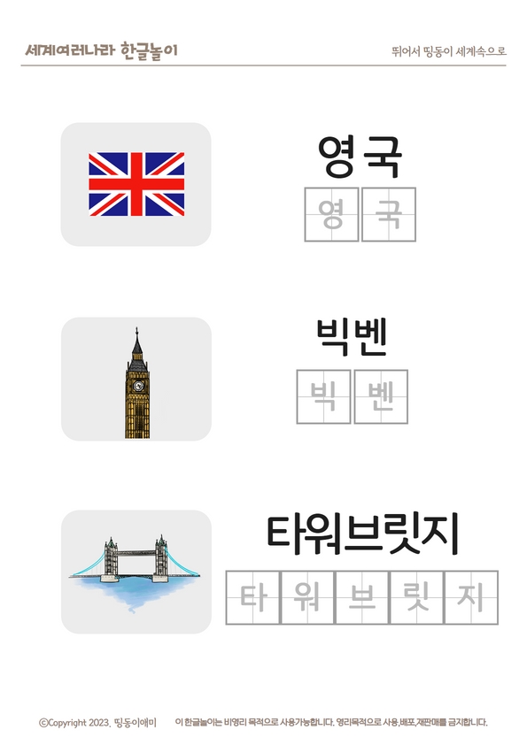 이번에 가져온 도안은 5~8세 친구들을 위한 영국 관련 랜드마크 글씨 쓰기를 가지고 왔습니다. 영국의 빅벤과 타워브리지는 세계 랜드마크하면 떠오르는 유명한 건축물들 중에 꼭 포함되는 것들이지요. 오늘은 도안 공유전 가볍게 영국의 랜드마크에 관한 짧은 이야기를 준비해 봤습니다. 시간이 부족하신 분들은 밑으로 바로 내려가시면 됩니다~ ^^ 1. 영국의 빅벤 빅벤은 영국의 수도 런던을 상징하는 대표적인 랜드마크로 국회의사당(웨스트민스터 궁전) 북쪽 끝에 있는 시계탑을 가리키는 별칭입니다. 이 시계탑의 공식 명칭은 빅벤이 아닌 엘리자베스타워라고 합니다. 빅벤에는 무려 13톤에 육박하는 종이 있습니다. 2017년 이전에는 15분 간격으로 울려 시간을 아렸으나, 노후화 문제로 인하여 현재까지 보수공사 중이라고 합니..