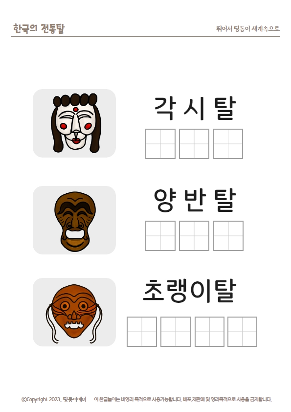 4. 한국탈 하회탈 각시탈 한글 쓰기 학습지 pdf 파일 공유