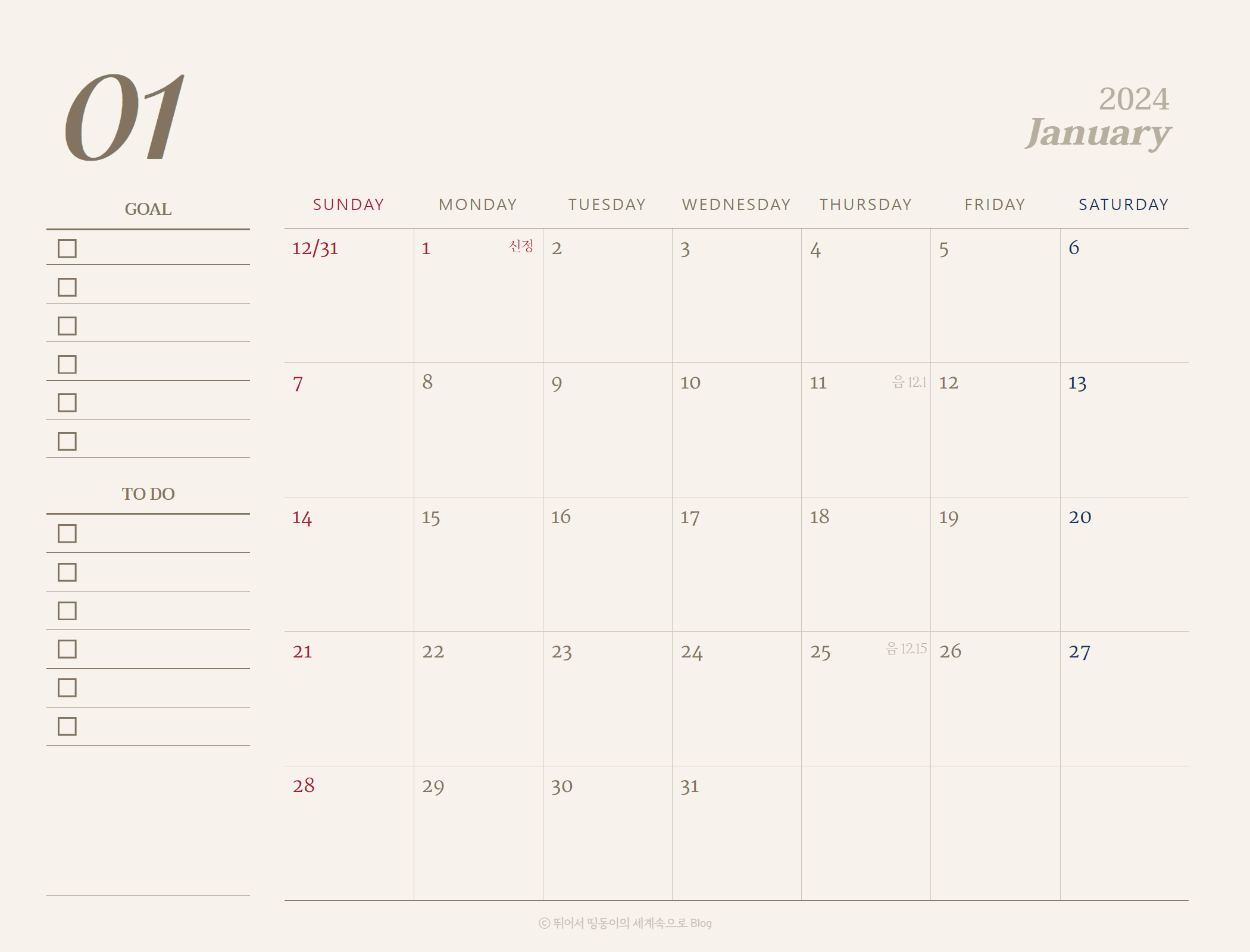 목표 적는 부분이 없는 기본 달력이 필요하시면 아래 포스팅에서 다운받으시면 됩니다.