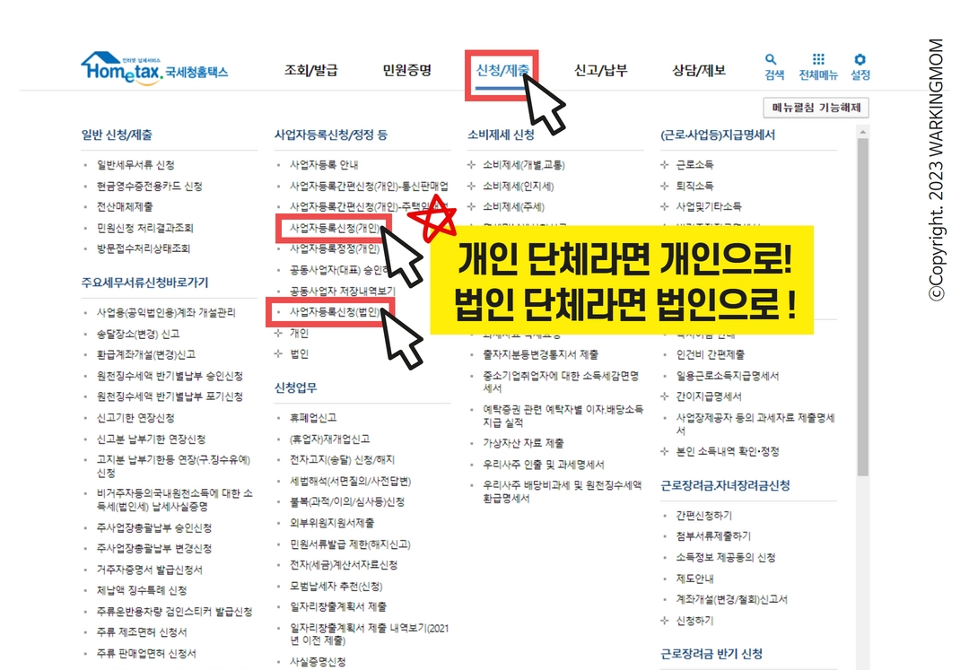 3. (신청/제출) 메뉴 클릭 후 사업자등록증신청(개인)을 눌러주세요!