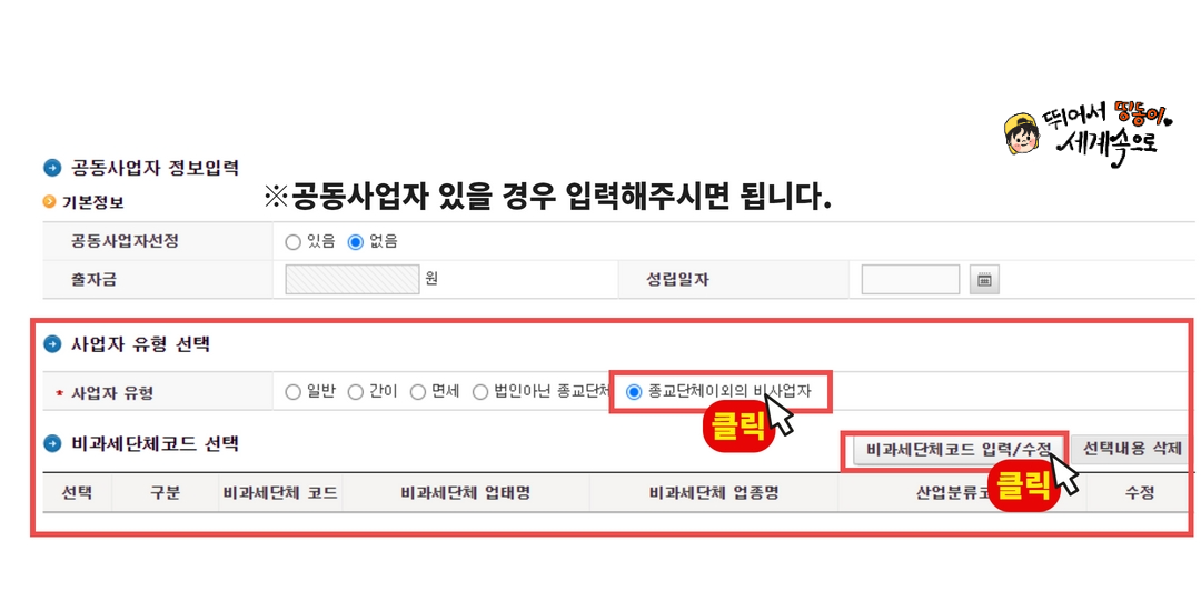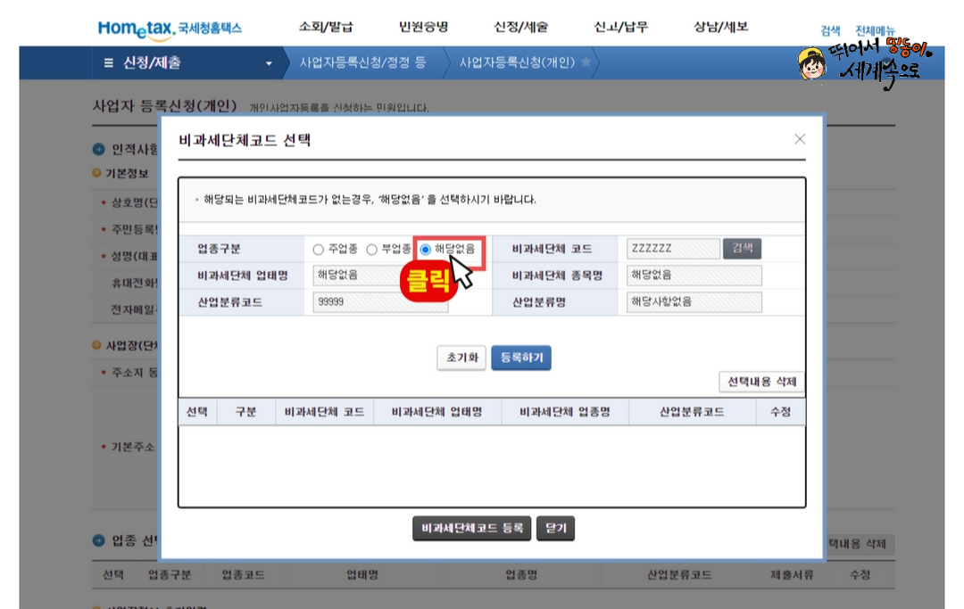 누르고, 비과세단체코드 등록 눌러주세요.