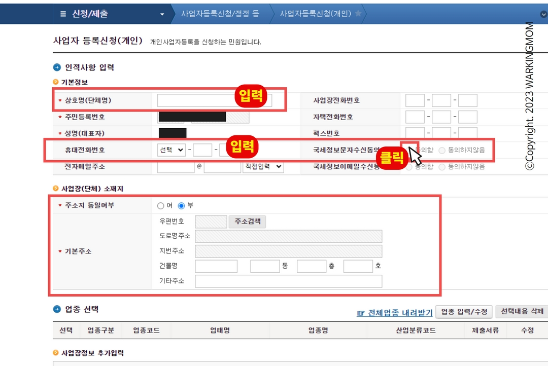 사업설명, 개업일자 입력해 주세요.