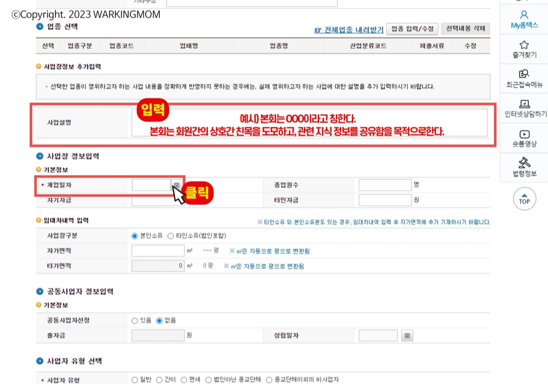 6. 사업설명 / 개업일자 입력해 주세요