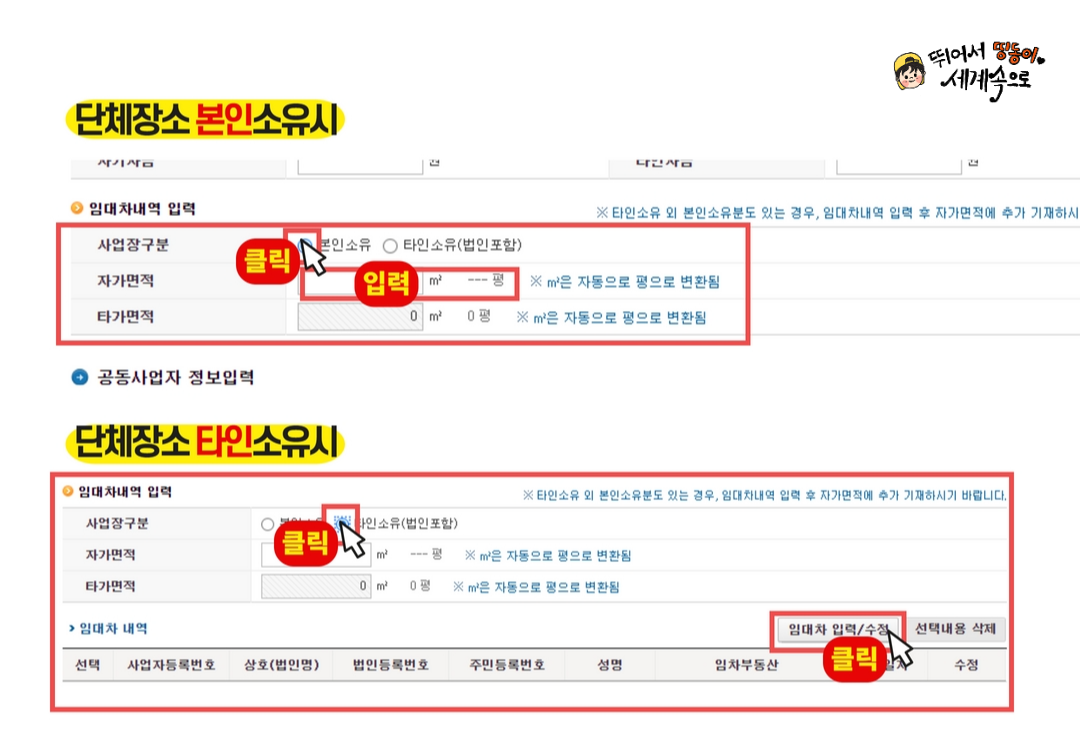 임대차 내역을 입력해 주시면 됩니다. 단체의 장소가 본인소유라면 본인소유로 클릭하고