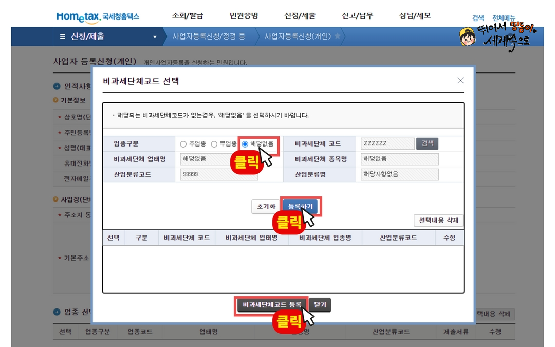 누르고, 비과세단체코드 등록 눌러주세요.